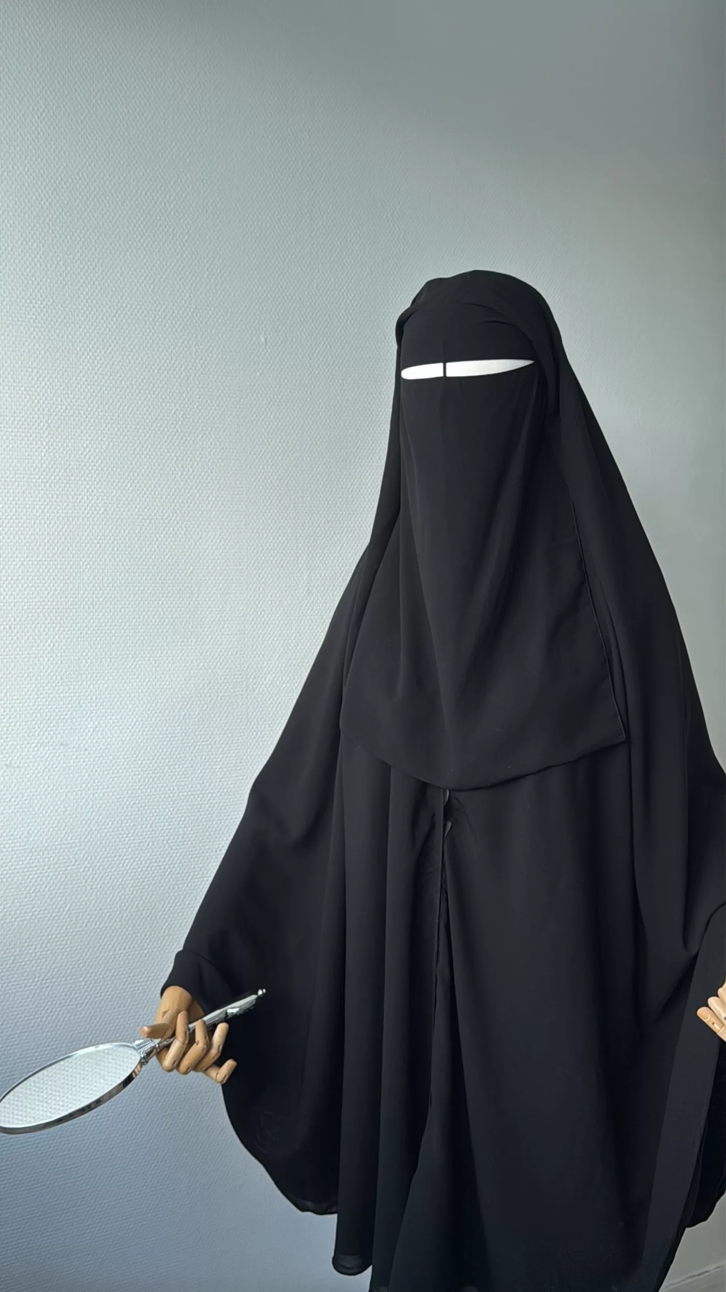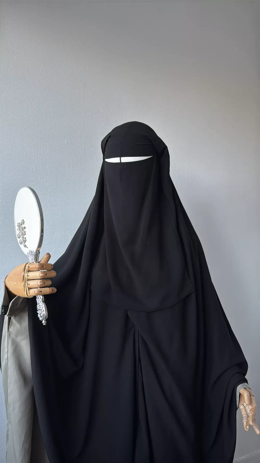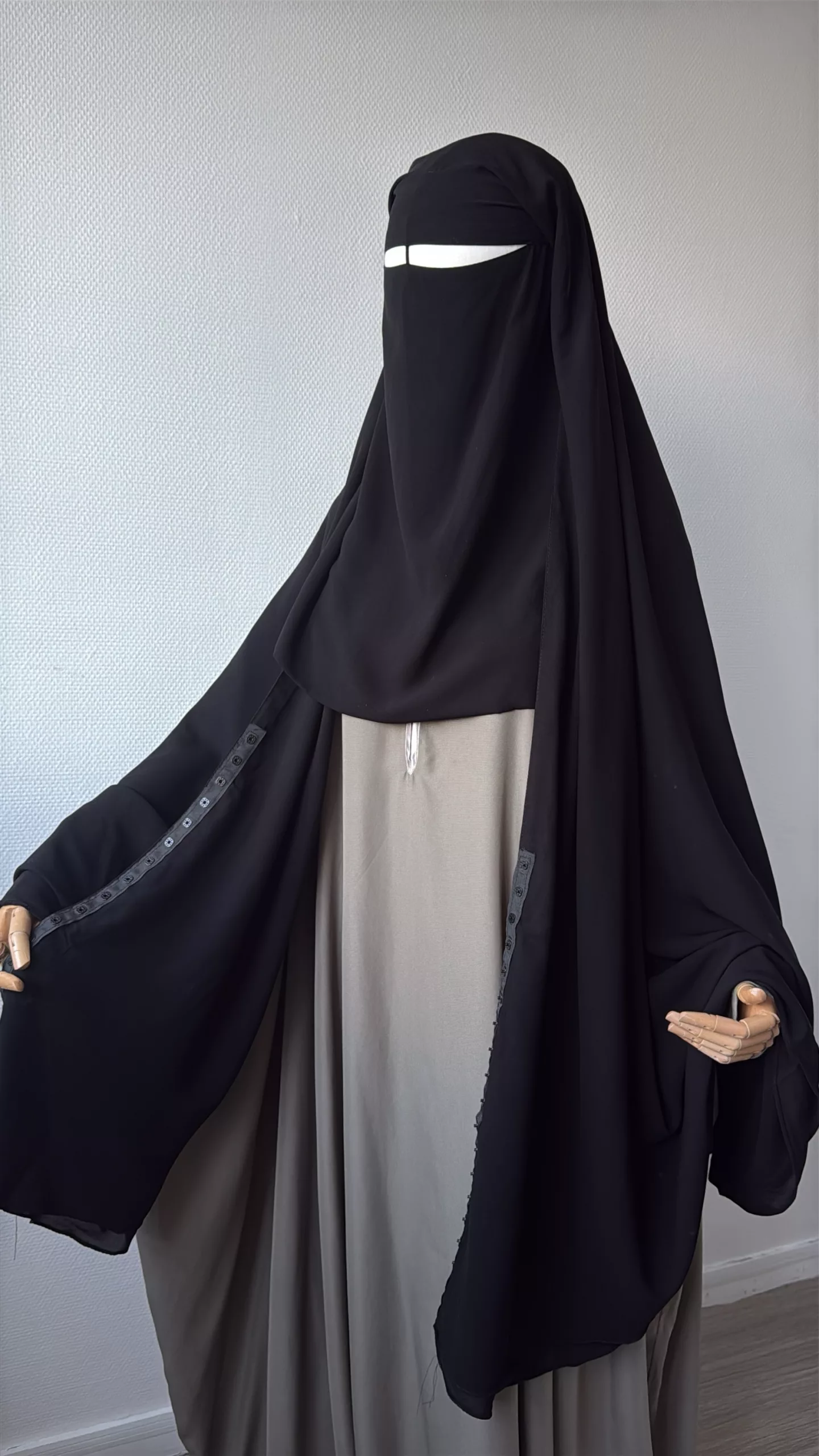Le niqab cape Khadija se distingue par sa coupe fluide et ample, offrant une grande couvrance tout en restant léger et confortable, ainsi que par sa cordelette située entre les yeux.
