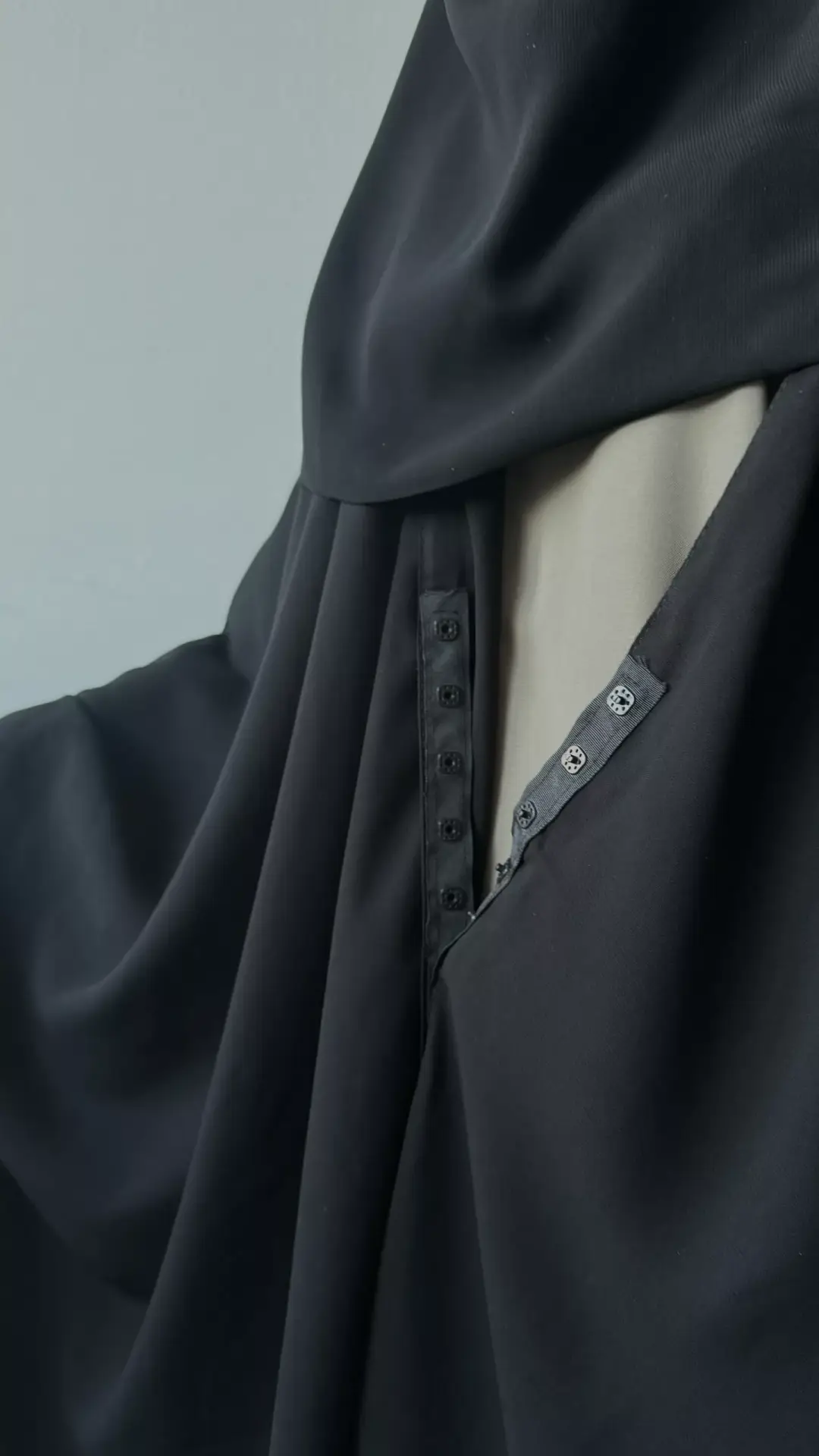 Il est doté de boutons-pression sur les côtés, permettant une couvrance maximale et un effet khimar.